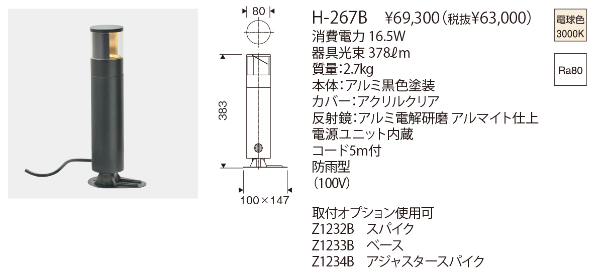 ポール径Φ80mmの優れた拡張性を持つボラードシリーズです。照射方向はアッパー・ダウン・ワンサイドから選択できます。設置方法は本体に取付オプションのスパイク・アジャスタスパイク・ベースを組み合わせてご利用ください。