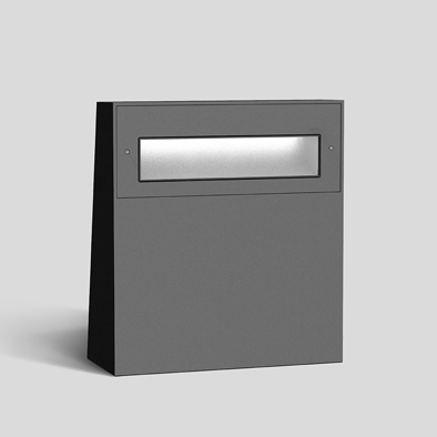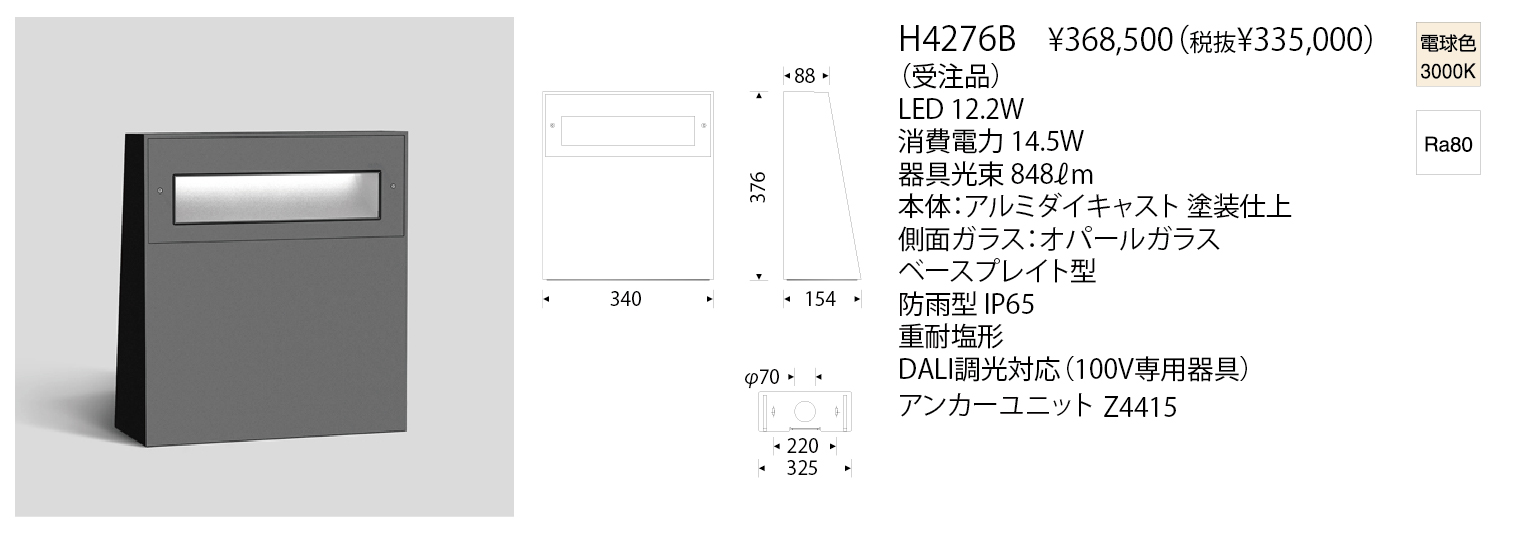器具の前方向の地表面を広範囲に照度確保が可能なLEDボラードです。H4276Bは低い位置から光を照射しながら器具正面の約3m先で床面照度1lxを確保できます。設置する空間・必要とする床面照度からお選びください。設置方法はベースプレート型ですがアンカーユニット併用で埋込に対応可能です。