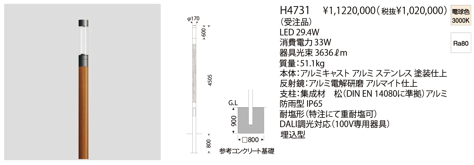 LIGHT BUILDING ELEMENTSは建築空間に溶け込むデザイン要素として、屋外の公共スペースをゾーニングし構造化する照明器具です。配光を選択することで、使用空間に合わせて建築構造を引き立てたり、歩行者や車両の誘導にも使用することができます。耐久性に優れたアルミと木材の融合を図った照明器具です。ポール高4505mm・Φ170mmの器具でワイド配光です。