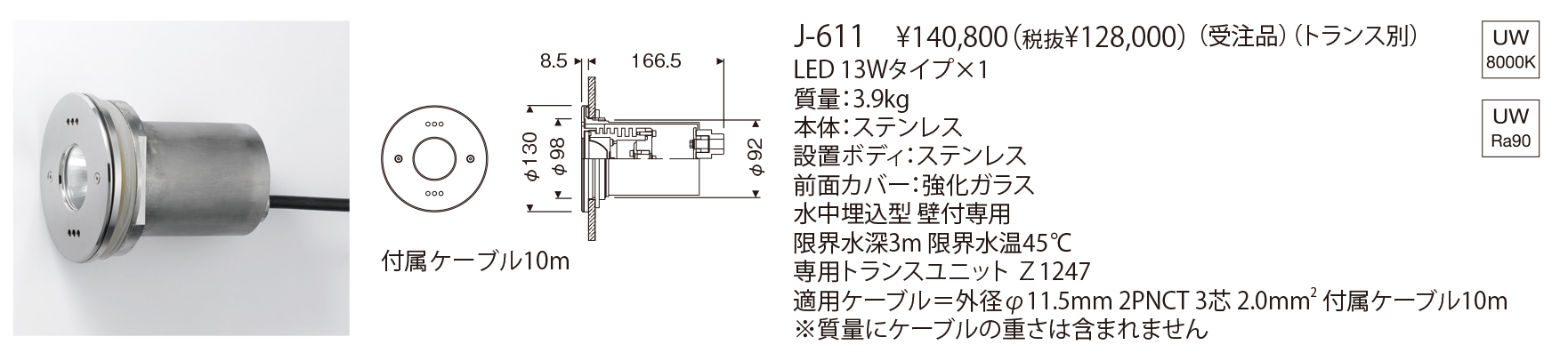 水中壁面に設置するタイプの水中照明シリーズです。灯具と設置ボックスは容易に取り外しができる構造です。LEDを使用した水中照明の中では最大級のパワーをもつ、13WのLEDを使用しています。パワーのある光は水中を明るく照らしだします。