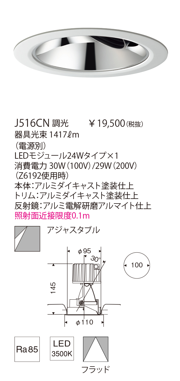2000ℓmのワンコアタイプのLEDモジュールを採用したハイパワーダウンライトです。天井切込径φ100mmは最小クラスのコンパクトとなっています。アルミ電解研磨仕上の反射鏡と高透過シリコンレンズの組み合わせで、グレアレスで質の高い光を実現しました。