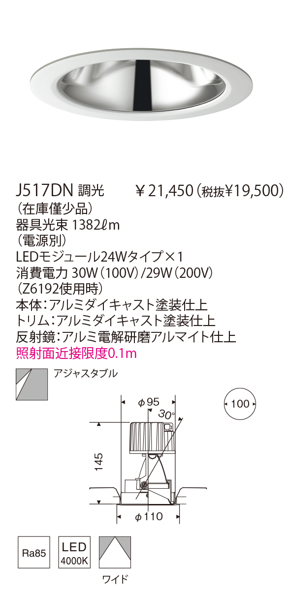 2000ℓmのワンコアタイプのLEDモジュールを採用したハイパワーダウンライトです。天井切込径φ100mmは最小クラスのコンパクトとなっています。アルミ電解研磨仕上の反射鏡と高透過シリコンレンズの組み合わせで、グレアレスで質の高い光を実現しました。