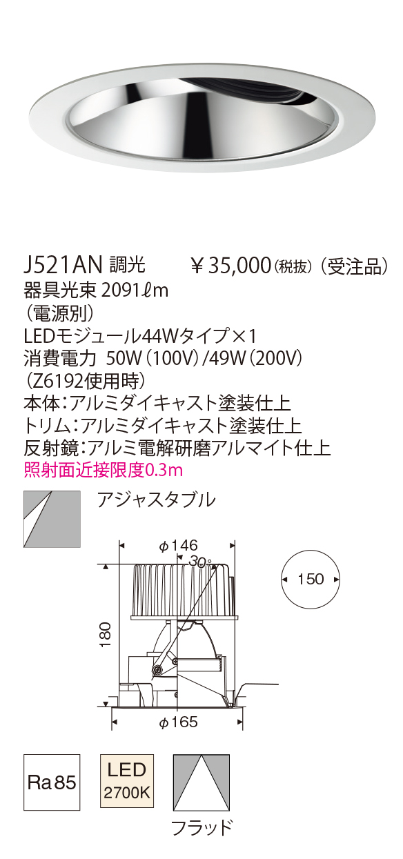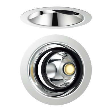 4000ℓmのワンコアタイプのLEDモジュールを採用したハイパワーダウンライトで天井切込径φ150mmです。吹き抜けのあるエントランスなど大空間でご使用ください。アルミ電解研磨仕上の反射鏡と高透過シリコンレンズの組み合わせで、グレアレスで質の高い光を実現しました。
