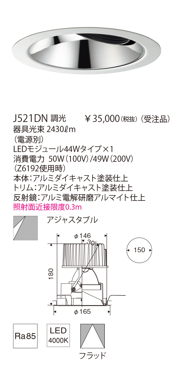 4000ℓmのワンコアタイプのLEDモジュールを採用したハイパワーダウンライトで天井切込径φ150mmです。吹き抜けのあるエントランスなど大空間でご使用ください。アルミ電解研磨仕上の反射鏡と高透過シリコンレンズの組み合わせで、グレアレスで質の高い光を実現しました。