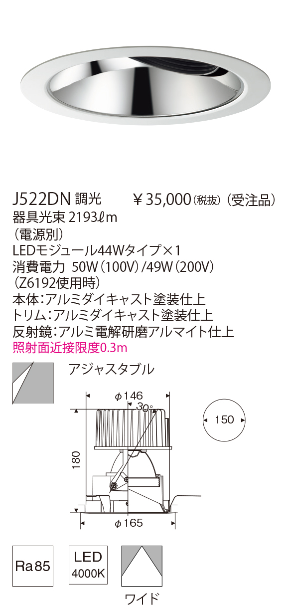 4000ℓmのワンコアタイプのLEDモジュールを採用したハイパワーダウンライトで天井切込径φ150mmです。吹き抜けのあるエントランスなど大空間でご使用ください。アルミ電解研磨仕上の反射鏡と高透過シリコンレンズの組み合わせで、グレアレスで質の高い光を実現しました。