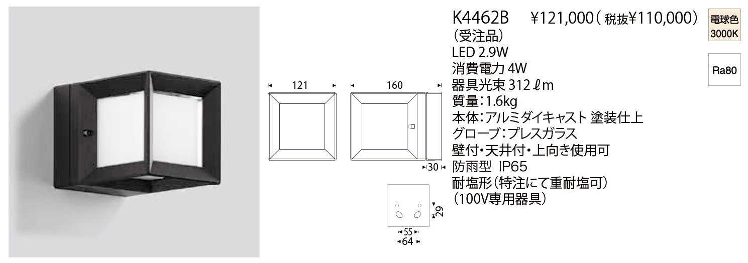 K4462B・K4465Bは正方形の内面白色のプレスガラスによる拡散タイプのフレーム付きブラケットです。K4462Bは壁付・天井付・上向き使用が可能です。