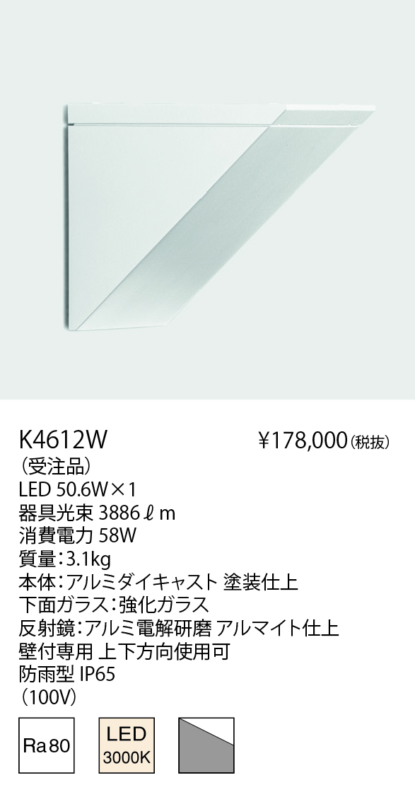 反射鏡で制御された K4612(B・W)とK4613(B・W)はサイズちがいの非対称配光のブラケットシリーズで上下方向で使用できます。