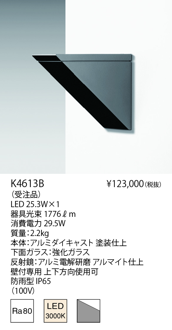 反射鏡で制御された K4612(B・W)とK4613(B・W)はサイズちがいの非対称配光のブラケットシリーズで上下方向で使用できます。
