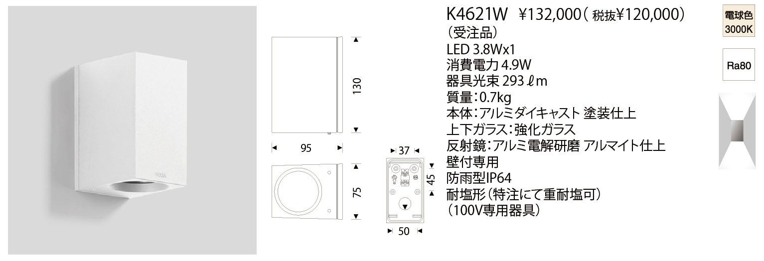 K4619・K4620・K4621は直方体タイプで上下配光でパワーにより3サイズあります。用途に合わせてお選びいただけます。白色は周囲に溶け込み、屋内でもご利用いただけます。