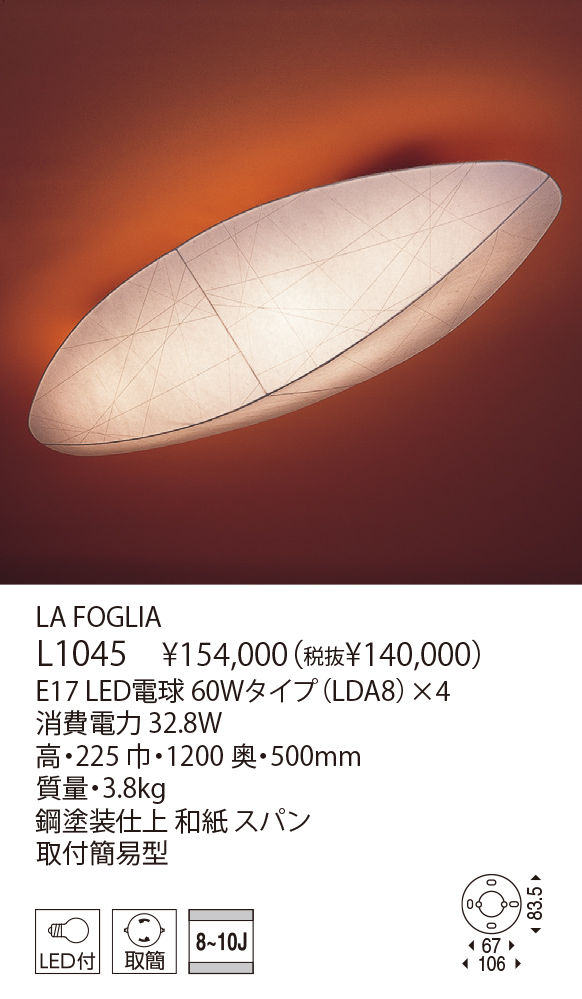 ラ・フォリアは和の趣を新しい角度からとらえた、自由で軽快なフォルムの和風照明シリーズです。素材の美濃紙は、紙漉きの途中で糸を型枠に張りめぐらし、上からもう一層の和紙を漉き込むという手間のかかる工程でつくられたものです。乱れ柄に糸を漉き込んだ個性的で渋い質感と、若々しく斬新なデザインが無理なく調和します。
