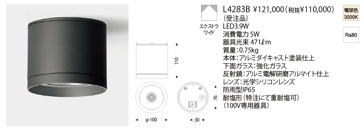 反射鏡とレンズを組み合わせたハイブリット光学システムによる直付ダウンライトです。直射光と反射鏡への光をレンズで制御するシステムです。Φ110mmのL4283(B・W)はエクストラワイド配光です。白色は周囲に溶け込み、器具の存在感を感じさせません。