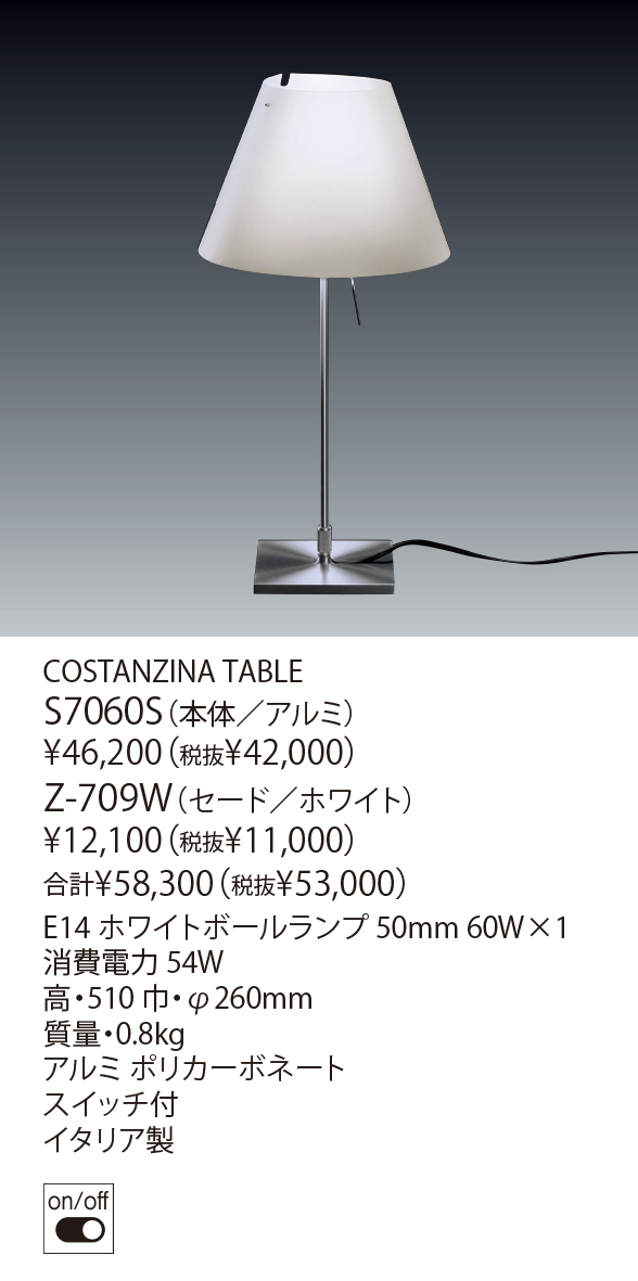 コスタンザとコスタンジーナは、ポリカーボネート製のシェードと軽量なアルミの本体で構成されたスレンダーでモダンなスタンドシリーズです。パオロ・リザットが1986年にデザインして以来、イタリアデザイン界の象徴的な存在として30年以上の時を経た今でもルーチェプラン社を代表する商品の一つとなっています。