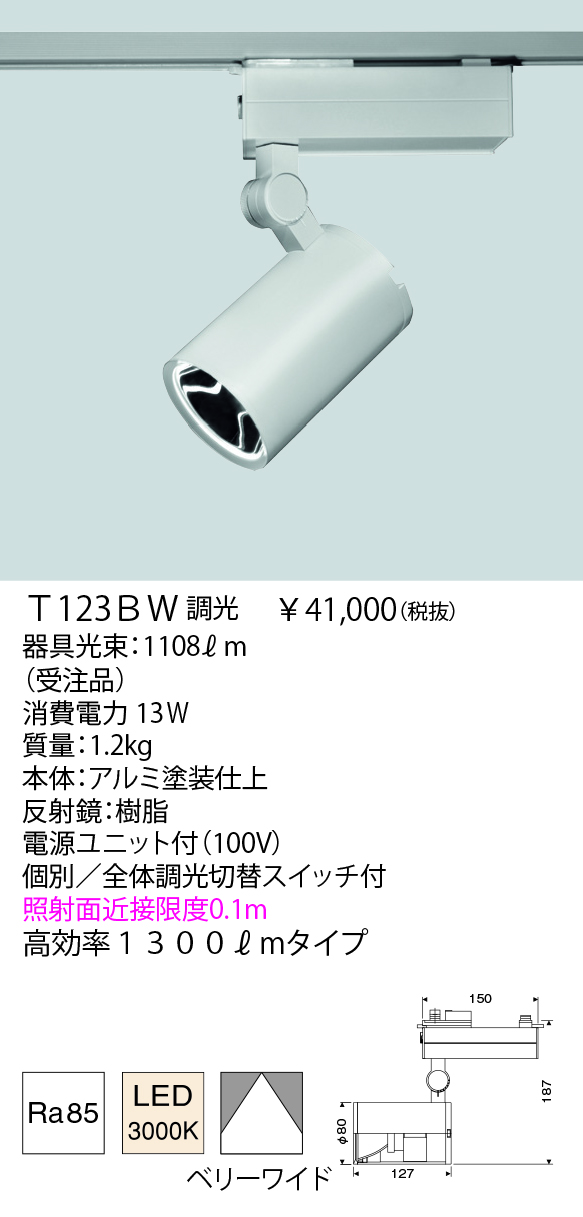 取付部分に電源BOXを一体化したデザインのスポットライトです。全体調光と個別調光の出来る切替スイッチがついていますので、必要な明るさを個々に得ることが出来ます。3種類の配光、4種類の色温度(光源色)が揃い、高出力タイプと高演色タイプが選択できます。