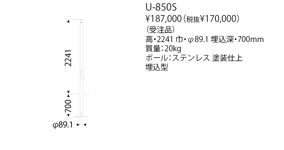 YAMAGIWA X-series POLE LIGHT Pole 2灯用 U-850S 税込み価格: 187,000円 (税抜 170,000円) スポット機能を持つ1300lmタイプのポール灯シリーズの専用ポールです。灯具に合わせて黒色・シルバーメタリックの2色からお選びください。 カタログを閲覧 Main Spec 寸法 高・2241 巾・φ89.1 埋込深・700 全長・2941mm 重さ・質量 20kg 材質・仕上 ポール:ステンレス 塗装仕上 取付方法 埋込型 備考 (受注品) Download データダウンロード チェックしたファイルをダウンロードします。 チェック全てをダウンロード 全て選択 小組画像 仕様図 取扱説明書 姿図1 姿図2 配光データ IESデータ 商品画像 3D CAD REVITデータ