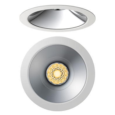 通常視野の上方向の範囲は、水平線に対して、30~35°の範囲です。この視野内に入ってくる方向の光がグレアの原因になります。「光の質」にこだわり、グレアカット角度を40°で設計しています。アルミ純度99.9%の完全鏡面反射鏡を採用し、グレアレスを追求しました。2種類の配光と4種類の色温度が揃い、高効率タイプと高演色タイプが選択できます。