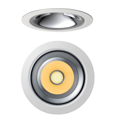 通常視野の上方向の範囲は、水平線に対して、30~35°の範囲です。この視野内に入ってくる方向の光がグレアの原因になります。「光の質」にこだわり、グレアカット角度を40°で設計しています。アルミ純度99.9%の完全鏡面反射鏡を採用し、グレアレスを追求しました。2種類の配光と4種類の色温度が揃い、高効率タイプと高演色タイプが選択できます。