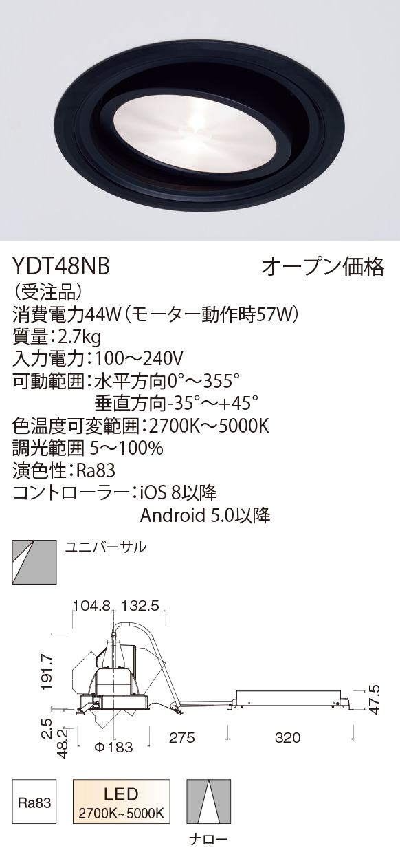 SALIOTの機能を取り込んだユニバーサルダウンライト 調色可変機能もプラスして色温度まで自由自在にコントロールリモート操作により、照射方向の上下左右、調光、色温度変化が可能で、多彩なレイアウト変更にも瞬時に対応可能です。広い照射範囲で天井から、すばやく的確に照明をコントロールします。φ175の調光調色タイプと基本的な操作機能はそのままに小型化した店舗・レストランなどのインテリアデザインと高いレベルでの融合を目指したφ125の小型モデルの2サイズあります。