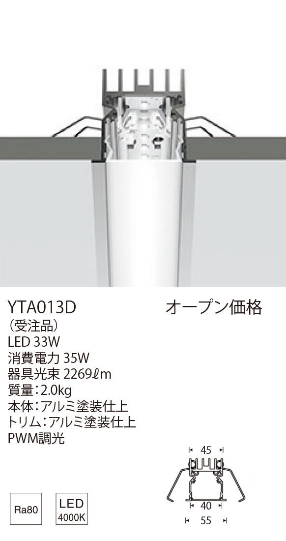 A.39は、袋具巾55mmで、3タイプの本体を目的の長さに合わせて連結して使用する高効率なライン照明です。90°のコーナー用の本体もあり、目的の室内設計に合わせて思い通りの光がデザインできます。本体は連結して使用しますが、下面のディフューザーは一体のため継ぎ目のない美しく連続した光が実現できます。光色は3000K・4000Kの2タイプがあります。