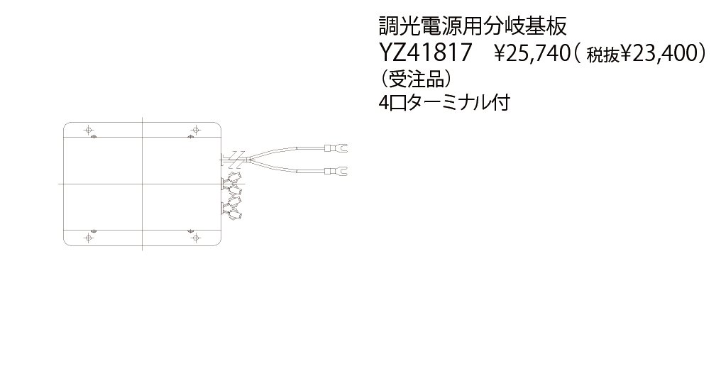 YAMAGIWA LED JACK SPOT 調光電源用分岐基板(生産完了品) YZ41817 オープン価格 LED JACK SPOT の調光電源用分岐基板です。 生産完了品 カタログを閲覧 Main Spec 特記事項 ※調光電源用分岐基板4口ターミナル付 備考 (受注品)※カタログ非掲載品の価格や仕様はカタログ掲載当時の内容です Download データダウンロード チェックしたファイルをダウンロードします。 チェック全てをダウンロード 全て選択 小組画像 仕様図 取扱説明書 姿図1 姿図2 配光データ IESデータ 商品画像 3D CAD REVITデータ Related Items 関連商品